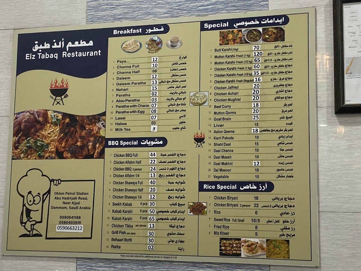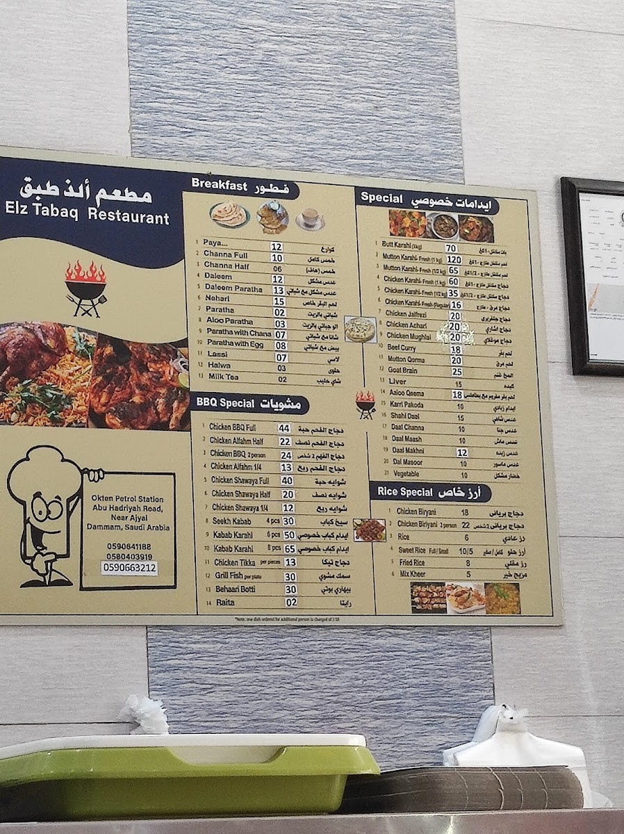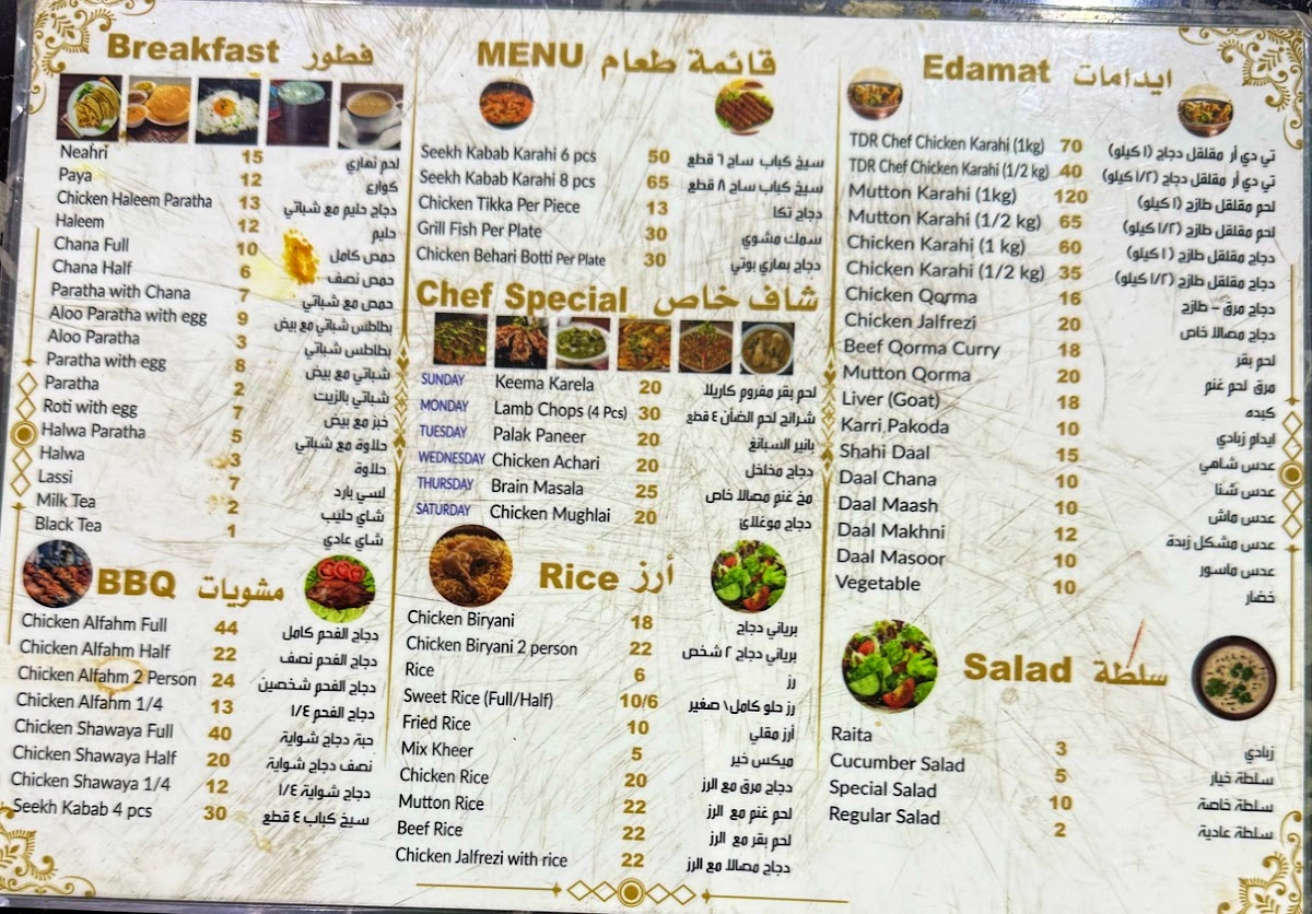 “ Had the beef kabob karahi (or fry, dunno what he said). It's beef kabobs bbq then put in a nice sauce. The medium is spicy for me. Had the beef korma also excellent. 100% Milk tea is good. The chicken pieces karahi is alright but the sauce is excellent. It's similar sauce to butter chicken. Bread is roti. It was supper time 7pm. I'll come again next week, God willing. We bought enough for 3-4 big guys. Spent about 120. Had decent amount left over. Had it a few times since, breakfast is ok, have haleem, ommelete and some beans..they have chapati bread then, I don't remember if they have roti as well. Also they deliver for 10 riyals depending on area. Call them and discuss, they speak English well. Once in about 8 meals I have some bone/cartilage/something hard in the kabob karahi. ”