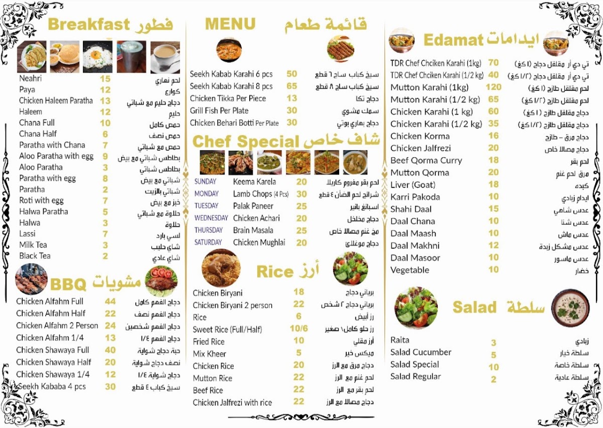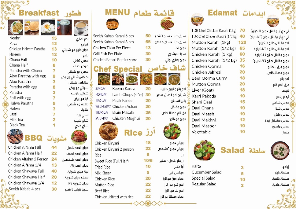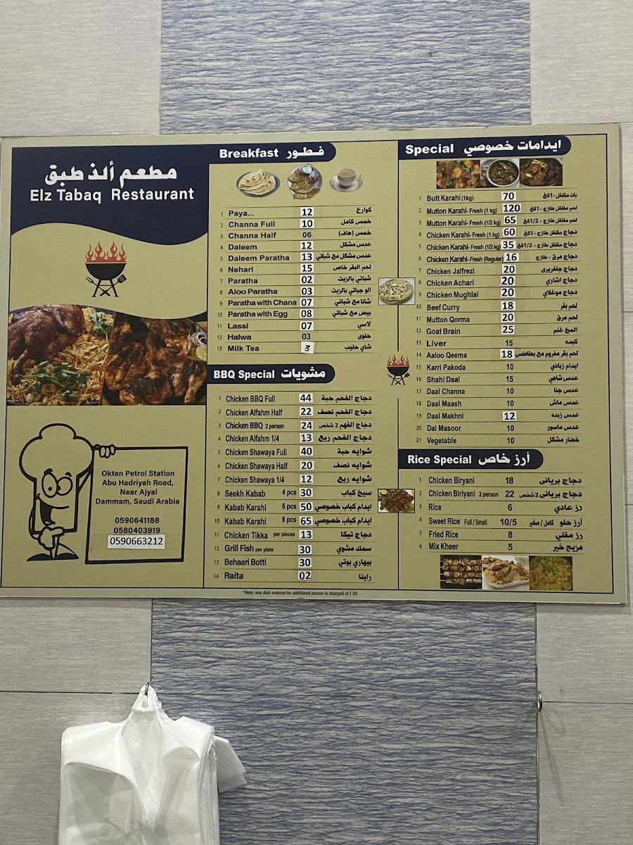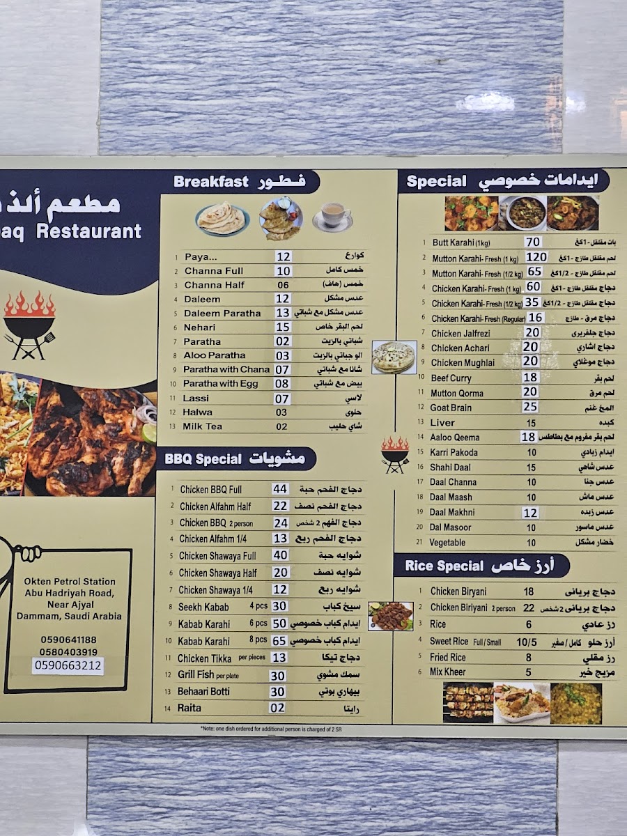 “ Had the beef kabob karahi (or fry, dunno what he said). It's beef kabobs bbq then put in a nice sauce. The medium is spicy for me. Had the beef korma also excellent. 100% Milk tea is good. The chicken pieces karahi is alright but the sauce is excellent. It's similar sauce to butter chicken. Bread is roti. It was supper time 7pm. I'll come again next week, God willing. We bought enough for 3-4 big guys. Spent about 120. Had decent amount left over. Had it a few times since, breakfast is ok, have haleem, ommelete and some beans..they have chapati bread then, I don't remember if they have roti as well. Also they deliver for 10 riyals depending on area. Call them and discuss, they speak English well. Once in about 8 meals I have some bone/cartilage/something hard in the kabob karahi. ”